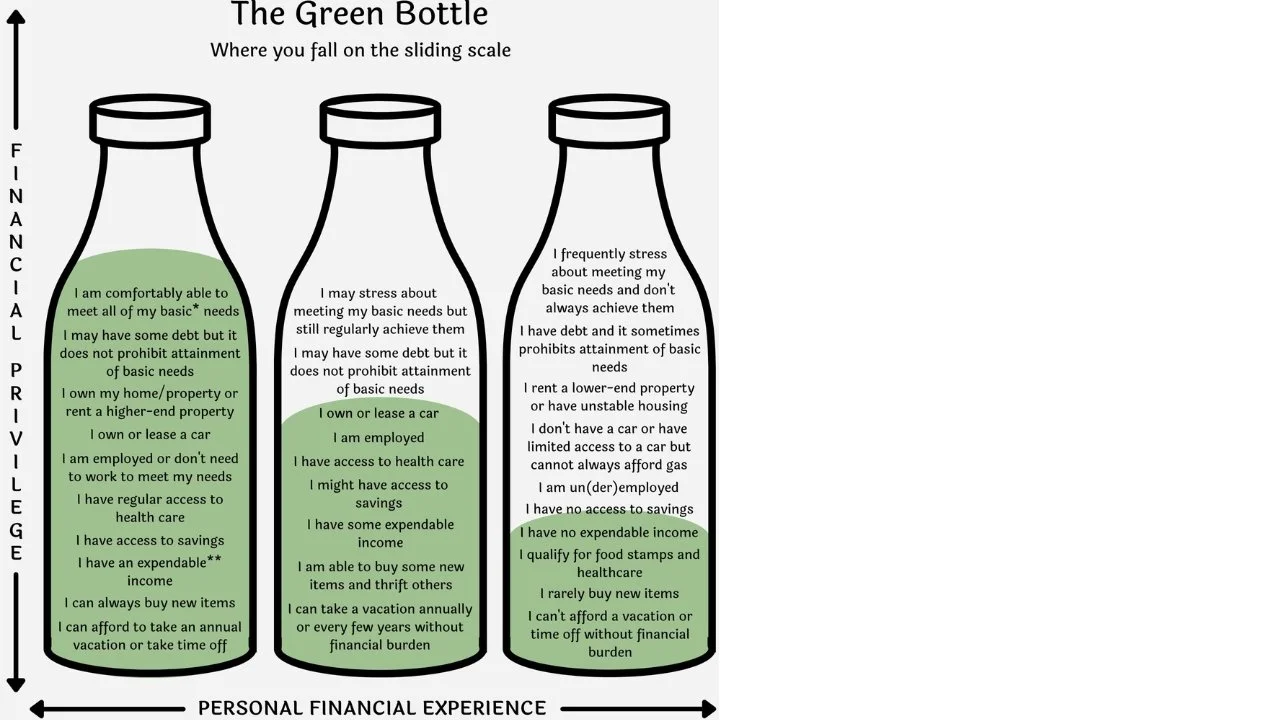 My sliding scale is informed by the work of community healer Alexis J. Cunningfolk of Worts + Cunning. I highly recommend reading her thoughts and resources on this topic. Her Green Bottle method, is outlined below to help guide you on where you fall on the sliding scale, should you choose to use it.